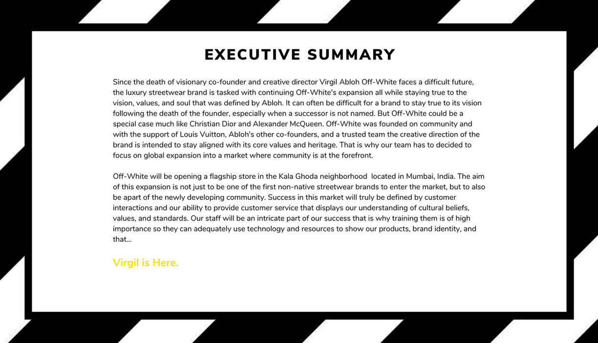 Off-White faces a new world, with the demise of its pope, Virgil Abloh. Given, it is a tricky situation for the brand when it comes to moving forward in a new direction, there are endless possibilities too with the brand's growth and creative direction. As part of our Global Expansion class, we decided to amplify the brand's influence and reach in the Asian market, specifically in India, which is seeing a rise in the streetwear industry. We have analysed the possible area where Off-White can launch their new store, along with careful consideration of the monetary factor involved. To read the complete project, download the pdf here.
